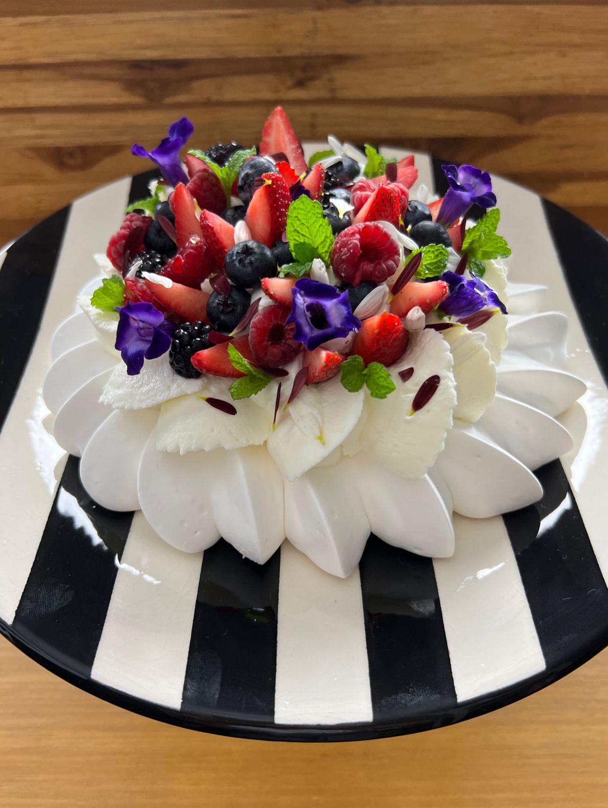 Uma sobremesa elegante com base de merengue, coberta com chantilly e frutas vermelhas frescas.