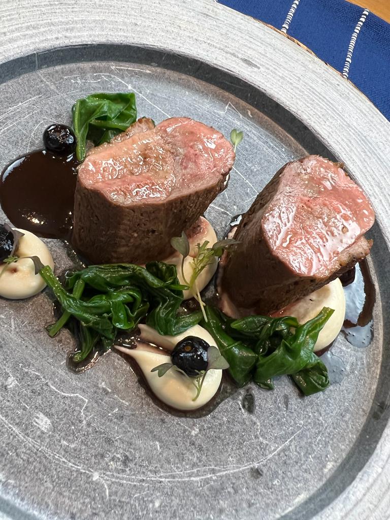 Peito de pato suculento servido com uma cremosa mousseline de amêndoas, espinafre e um aromático molho de Porto com ameixa.