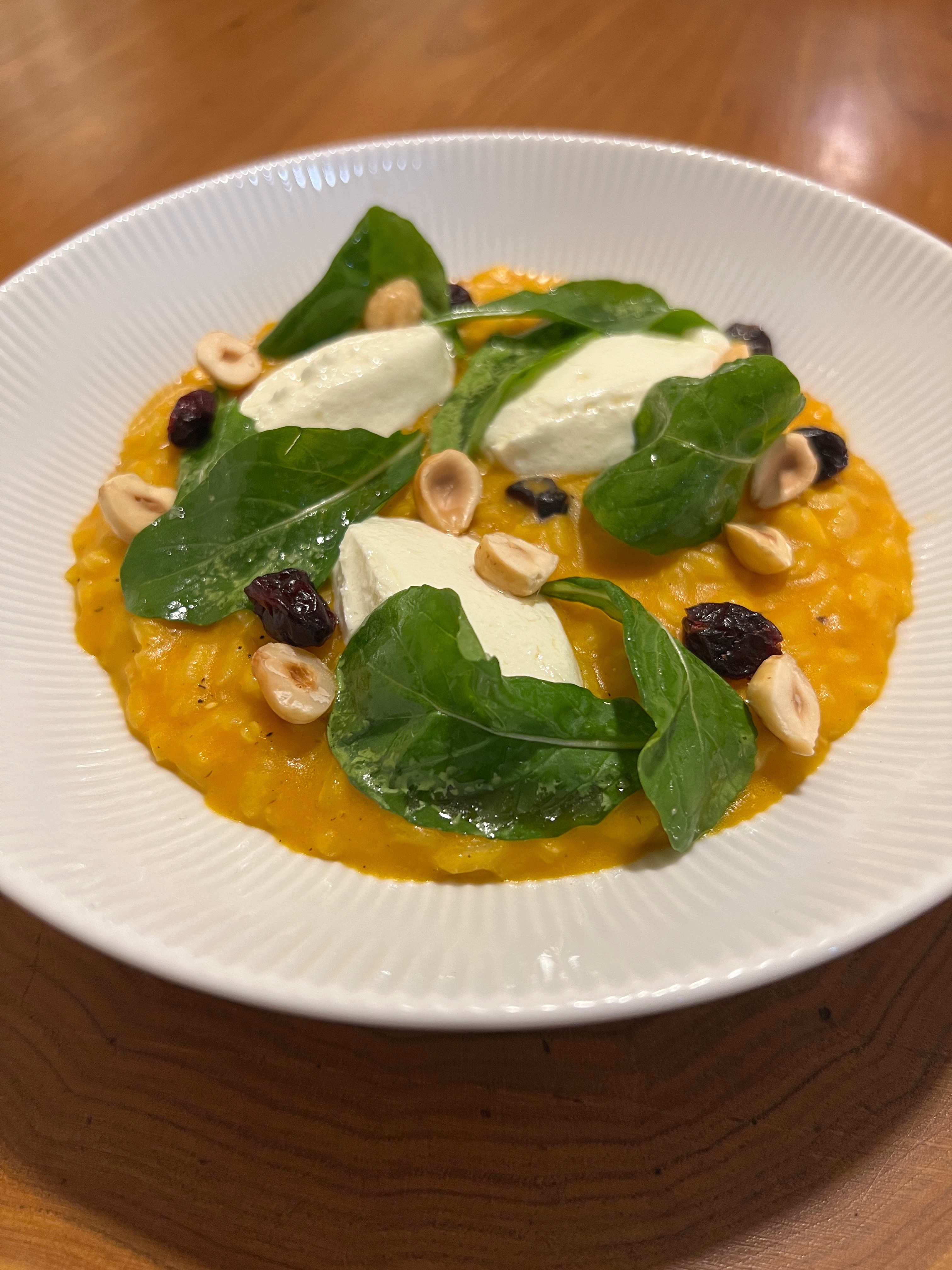 Um cremoso risotto de abóbora complementado com queijo de cabra, rúcula fresca, cranberry e avelãs torradas.