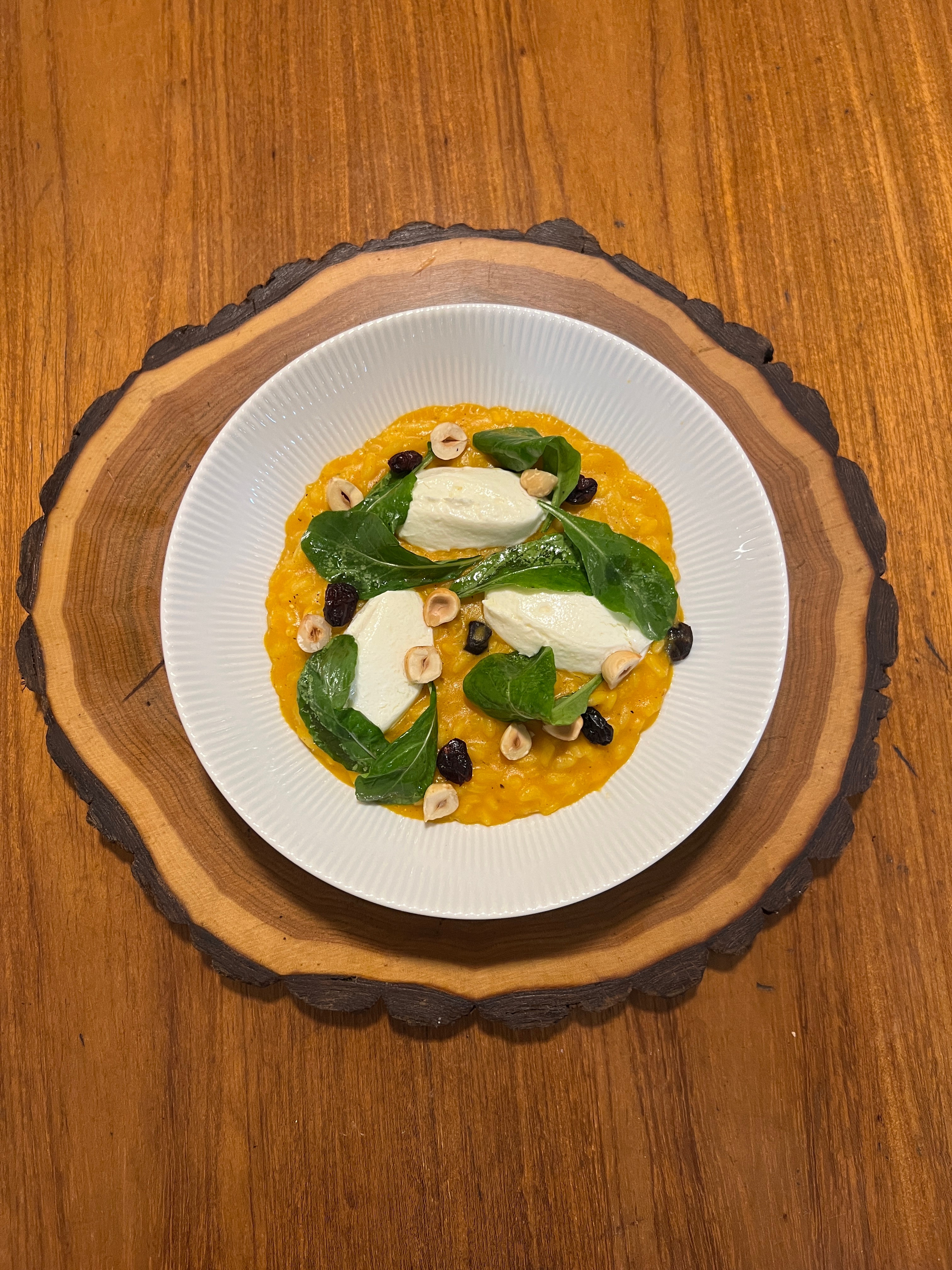 Um cremoso risotto de abóbora complementado com queijo de cabra, rúcula fresca, cranberry e avelãs torradas.
